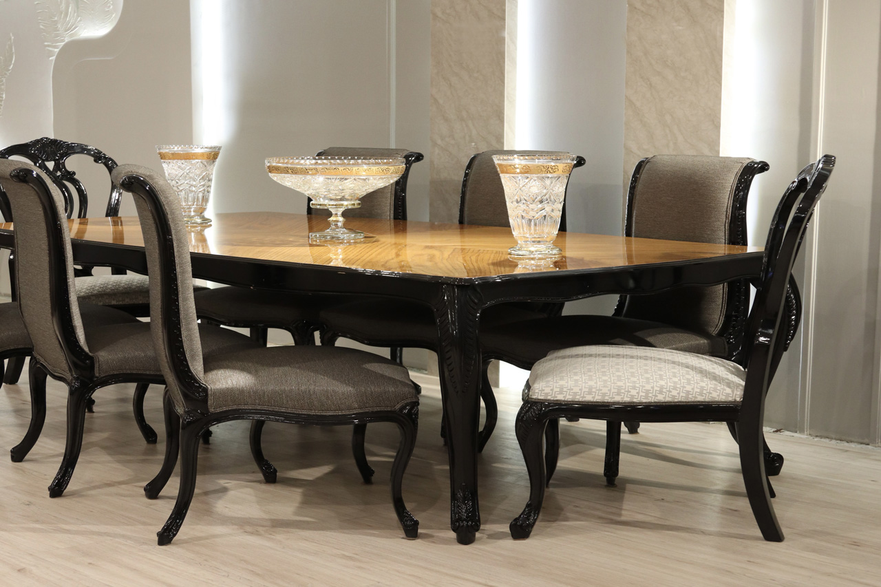 میز این سرویس نه‌تنها از نظر ابعاد متناسب با استفاده خانوادگی طراحی شده، بلکه سطح صیقلی و رنگ‌بندی آن درخشش خاصی به فضا می‌بخشد. هماهنگی میز با صندلی‌ها باعث می‌شود مجموعه‌ای کامل و یکپارچه شکل بگیرد که نگاه هر بیننده‌ای را جلب می‌کند.